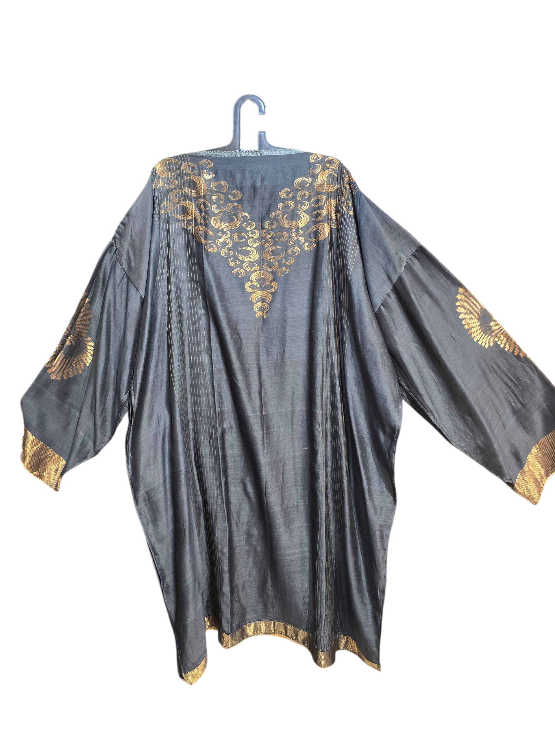 This semistitched 3 pc set features a mid calf length charcoal-blue grey silk kurta with intricate gold swirl embroidery at the neckline and cuffs, paired with a dramatic multitone silk dupatta in deep red, bronze, and teal featuring bold floral and geometric woven motifs, clean minimal fashion product photo, rich handloom-inspired styling worn with matching solid colour satin trouser pants, silver oxidised jewellery in earrings and bangles, golden matching heel sandles