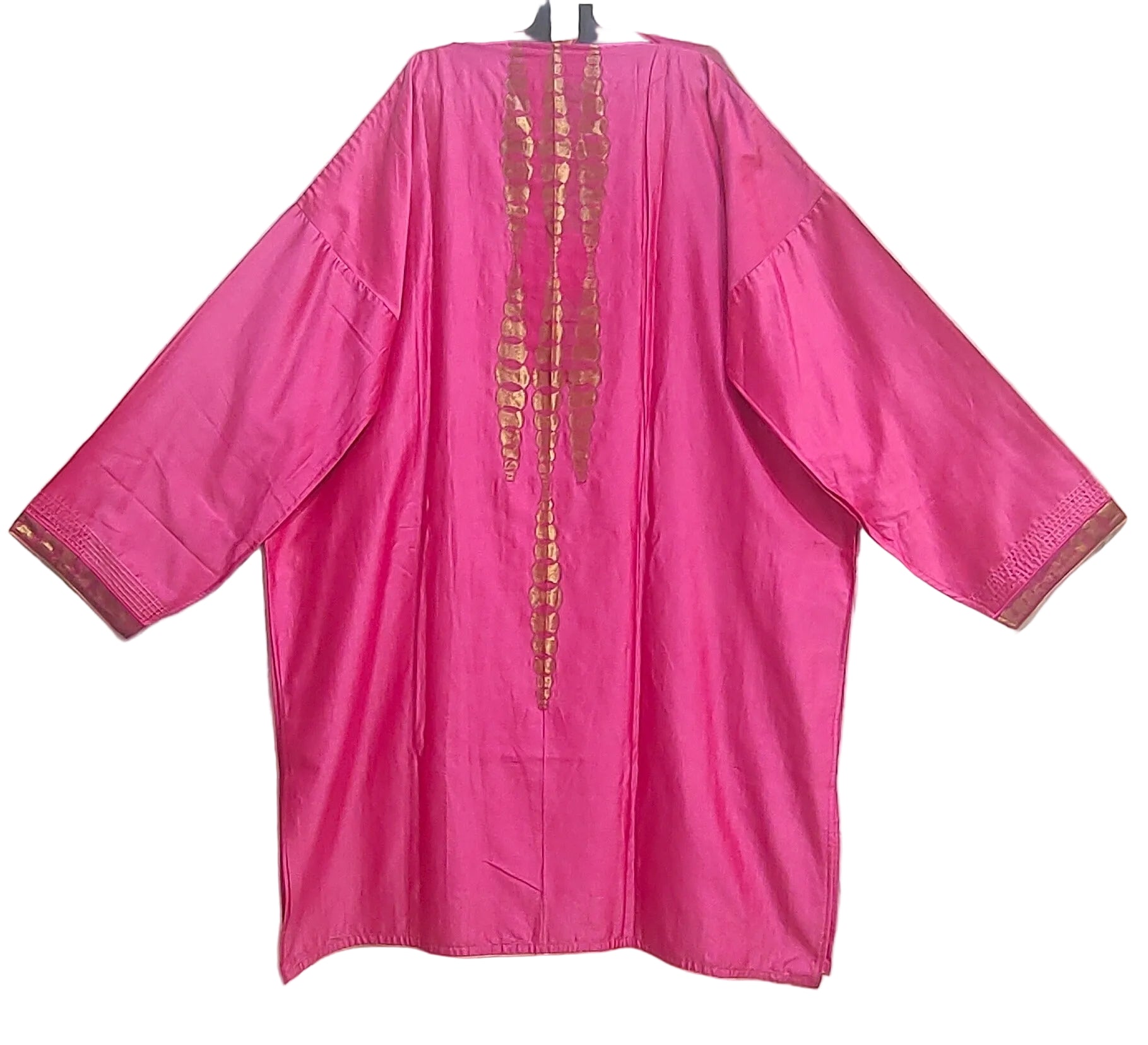 This semistitched 3 pc set features a mid calf length rani pink chanderi silk zari woven kurta with metallic gold thread motifs, styled with a dramatic chanderi dupatta with metallic gold zari woven motifs, complimented with exclusive hand zardozi embroidery borders worn with matching solid colour satin trouser pants