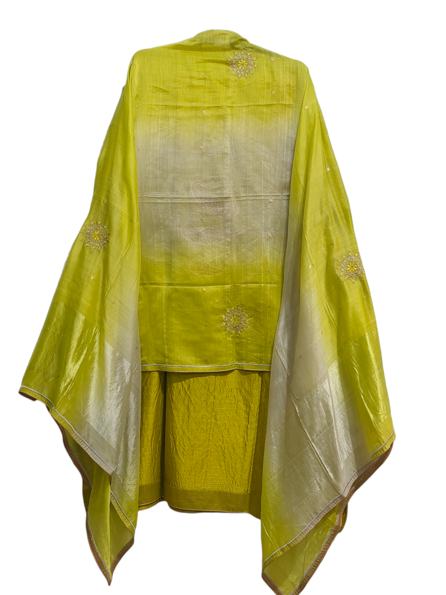 This semistitched 3 pc set features a mid calf length lime green chanderi silk zari zardozi embroidered kurta with paisley design layout, styled with a dramatic shaded chanderi dupatta with metallic gold zari embroidered medallion motifs, worn with matching solid colour satin trouser pants
