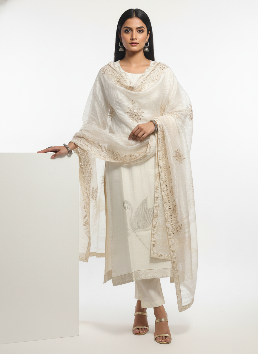 This semistitched 3 pc set features a mid calf length off white chanderi silk zari woven kurta with metallic silver flamingo bird motif, styled with a dramatic silk dupatta with hand embroidered gota zardozi floral design layout with borders and ari work, worn with matching solid colour satin trouser pants