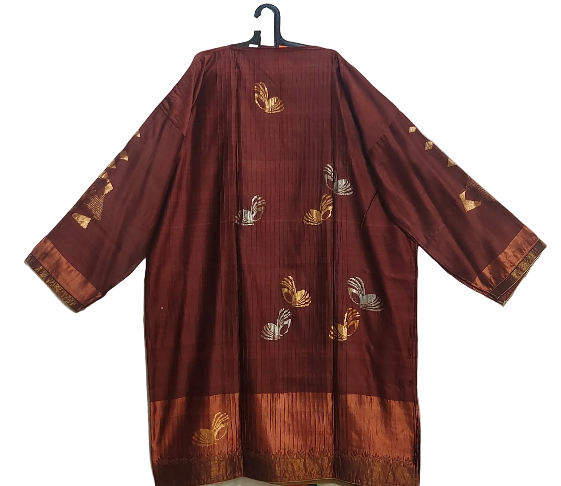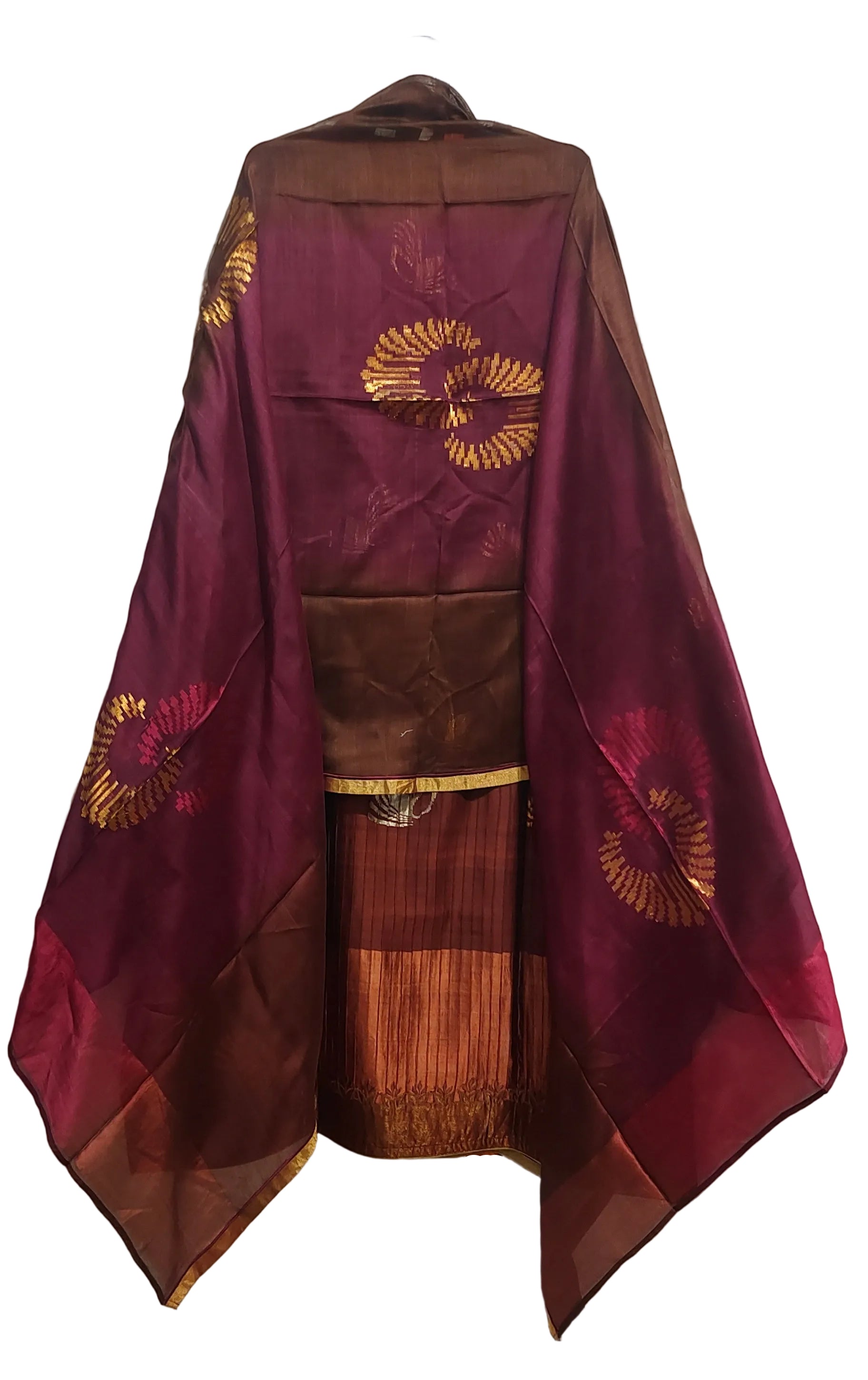 This semistitched 3 pc set features a mid calf length maroon chanderi silk zari woven kurta, styled with a dramatic shaded chanderi dupatta with metallic gold zari woven motifs, worn with matching solid colour satin trouser pants