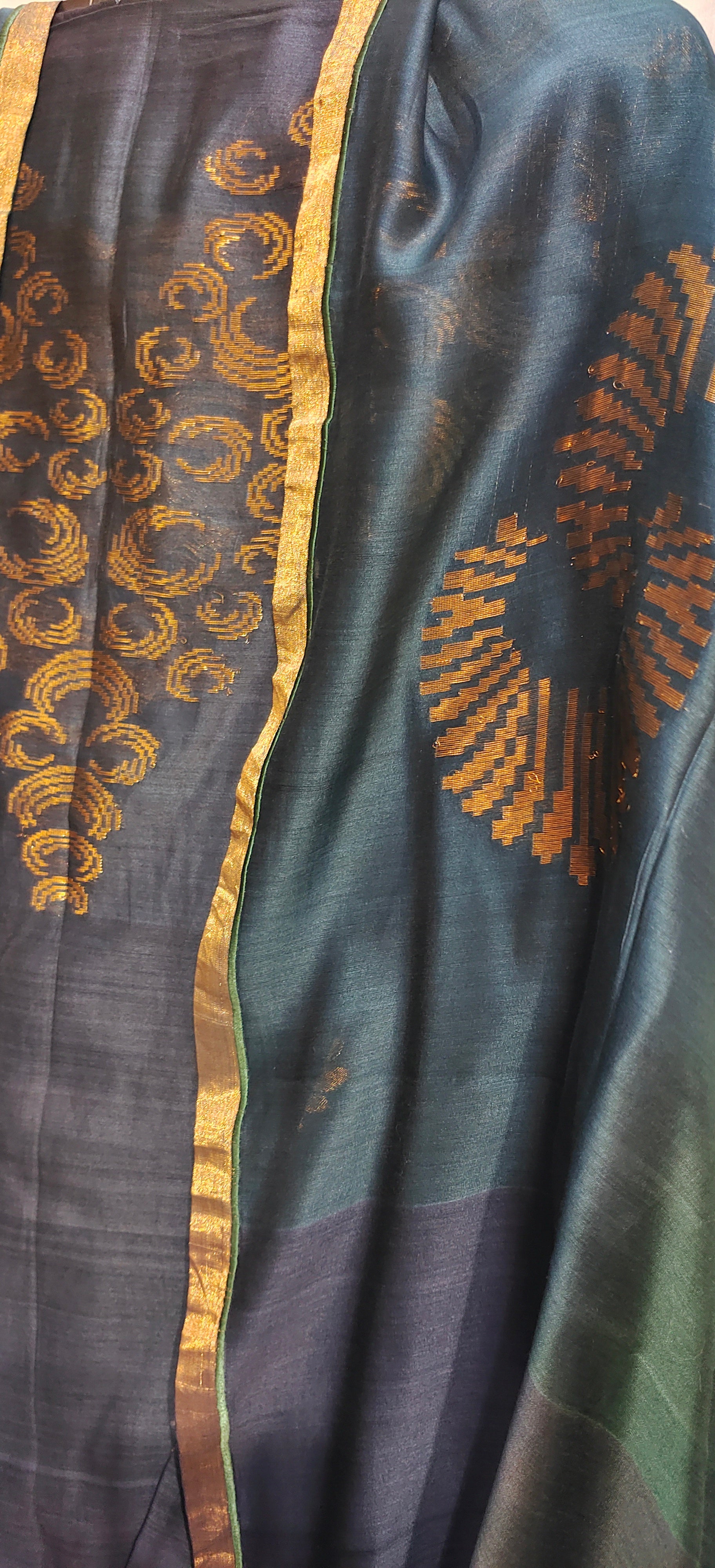 This semistitched 3 pc set features a knee-length straight-cut deep navy blue kurta with vertical texture detailing and intricate gold embroidery along the neckline, paired with matching tapered pants and a dual-tone green and navy blue dupatta featuring bold gold motifs and metallic border, styled in a high-fashion minimal pose with soft natural shadows,The dupatta measures 2.5 meters in length and 38 inches in width.The ensemble is provided with a matching cotton satin bottom material for 2.5 mts.