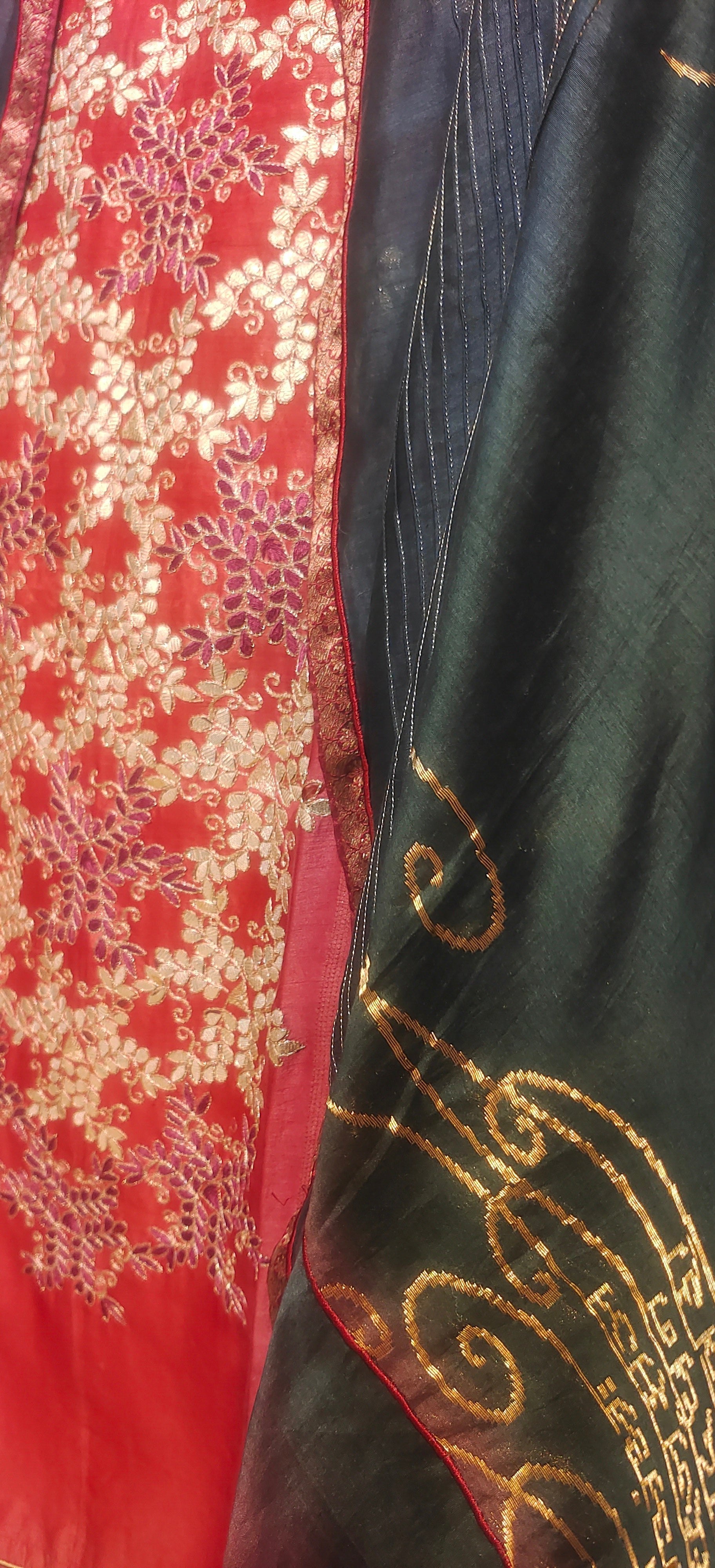 This semistitched 3 pc set features a knee-length straight-cut deep maroon silk kurta with intricate gold floral embroidery at the front, paired with matching tapered pants and a sheer black dupatta featuring ornate gold threadwork and a maroon border, styled in a poised minimal fashion editorial pose. The dupatta measures 2.5 meters in length and 38 inches in width.The ensemble is provided with a matching cotton satin bottom material for 2.5 mts.