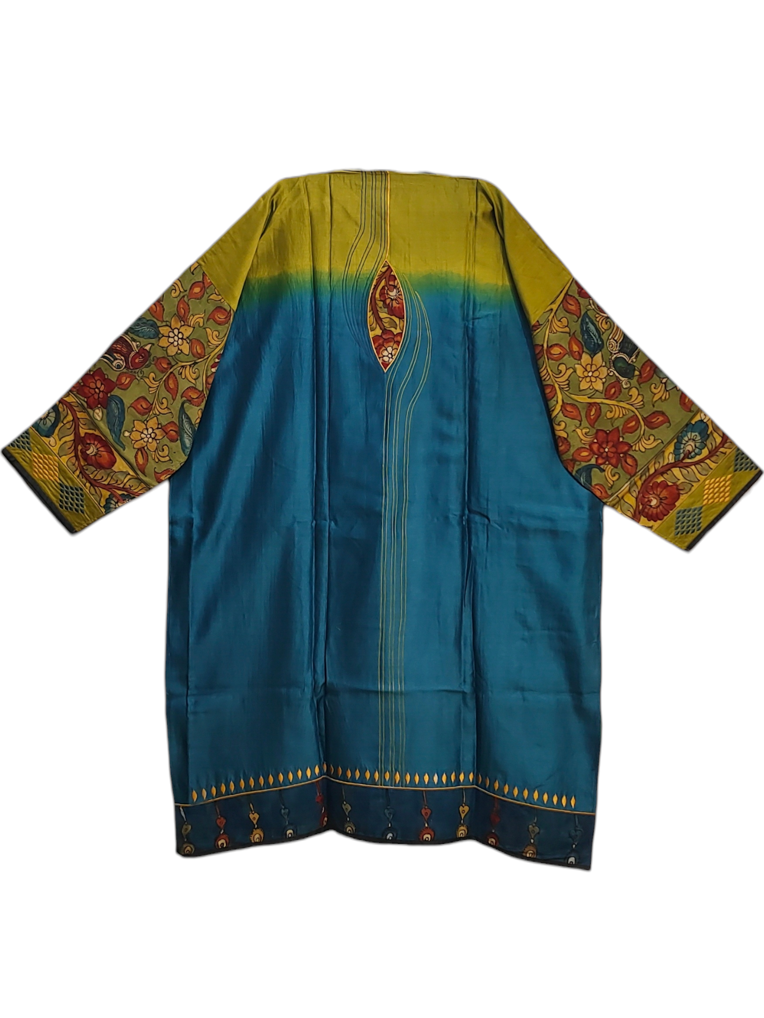 This semistitched 3 pc set features a vibrant long silk kurta in deep turquoise blue and lime yellow with full sleeves, featuring intricate hand-kalamkari floral and bird motifs on the chest and sleeves in red, white, and green, complemented by a gradient dupatta in deep blue and mustard with zari embroidery;