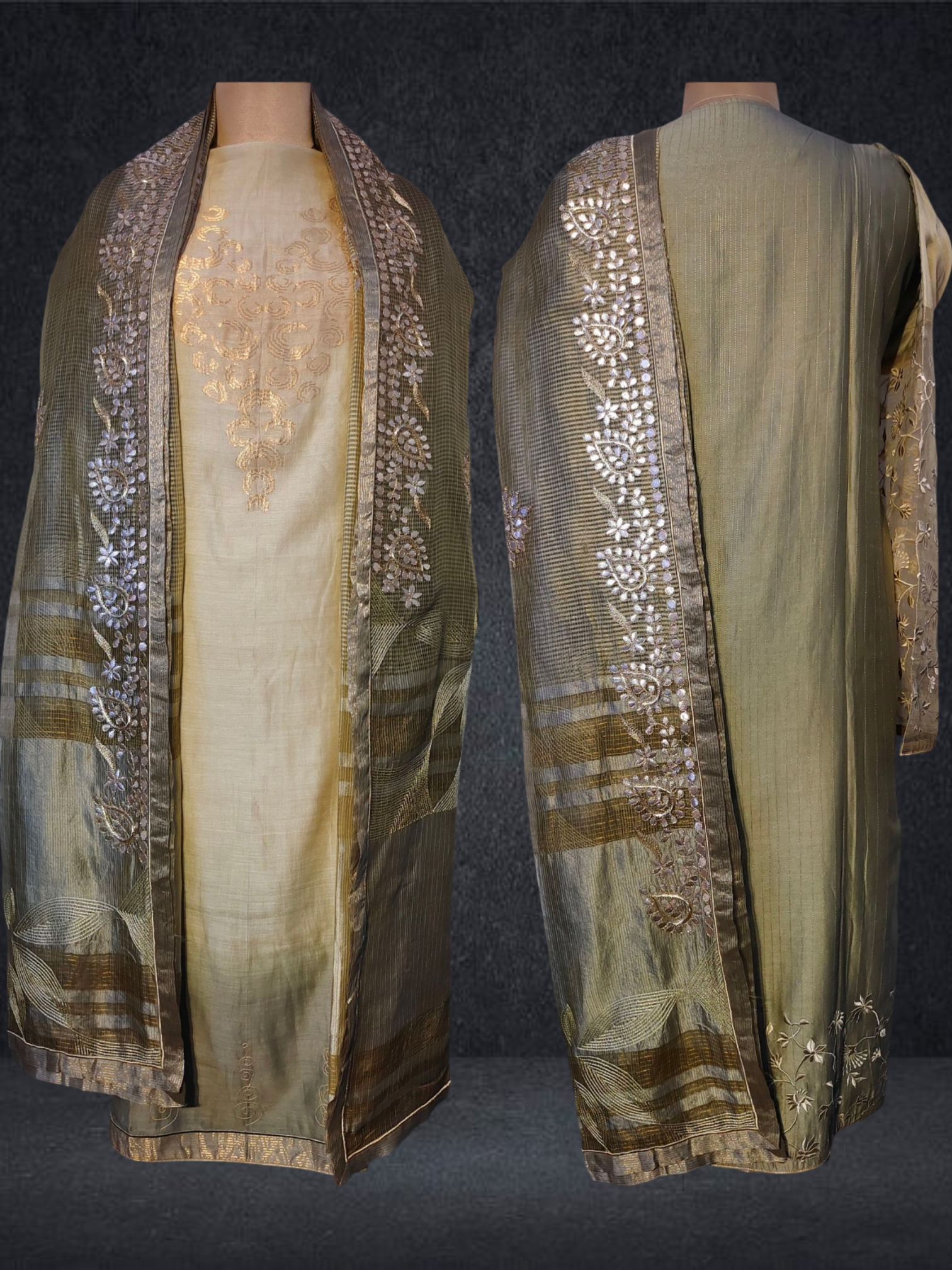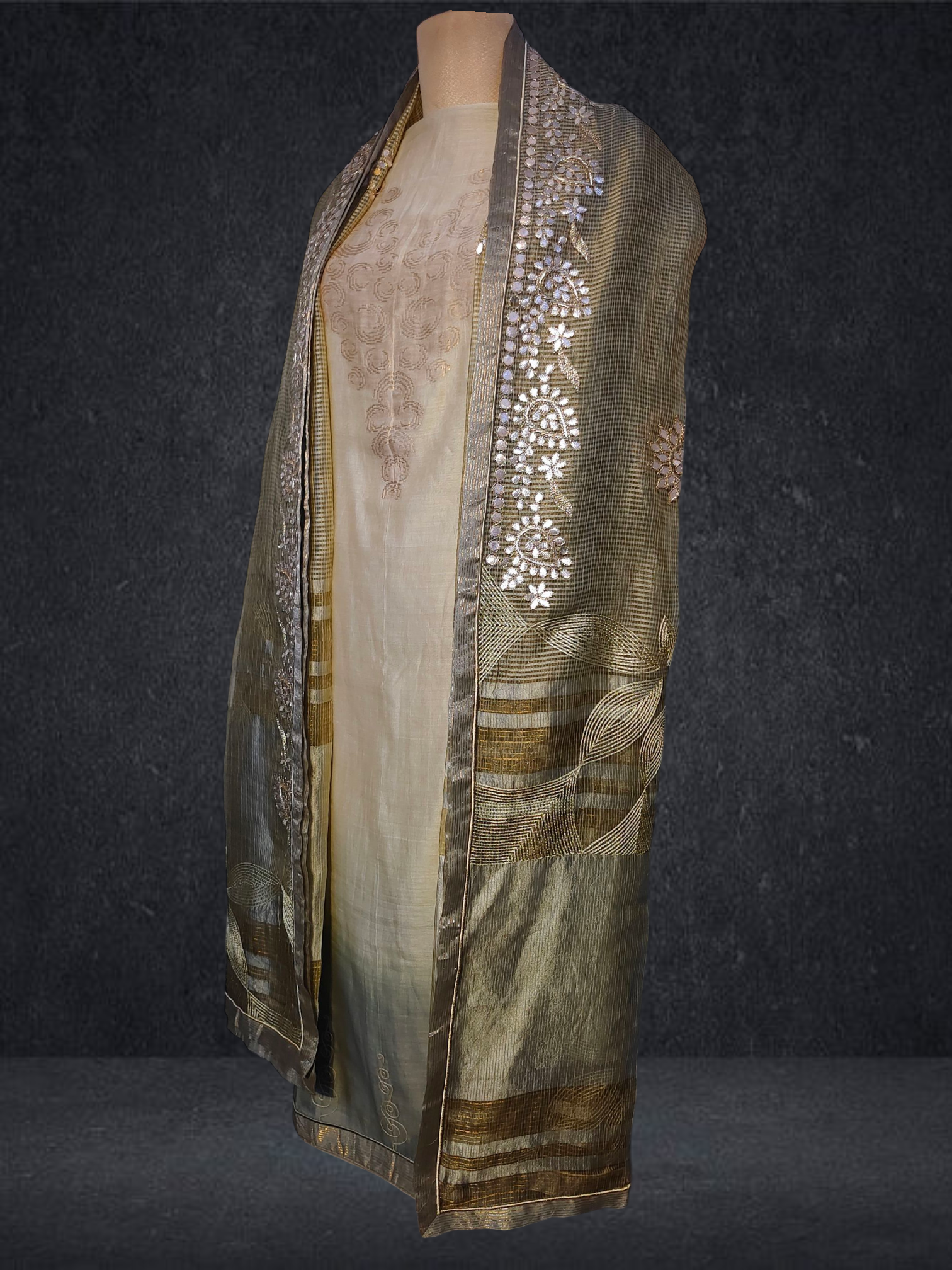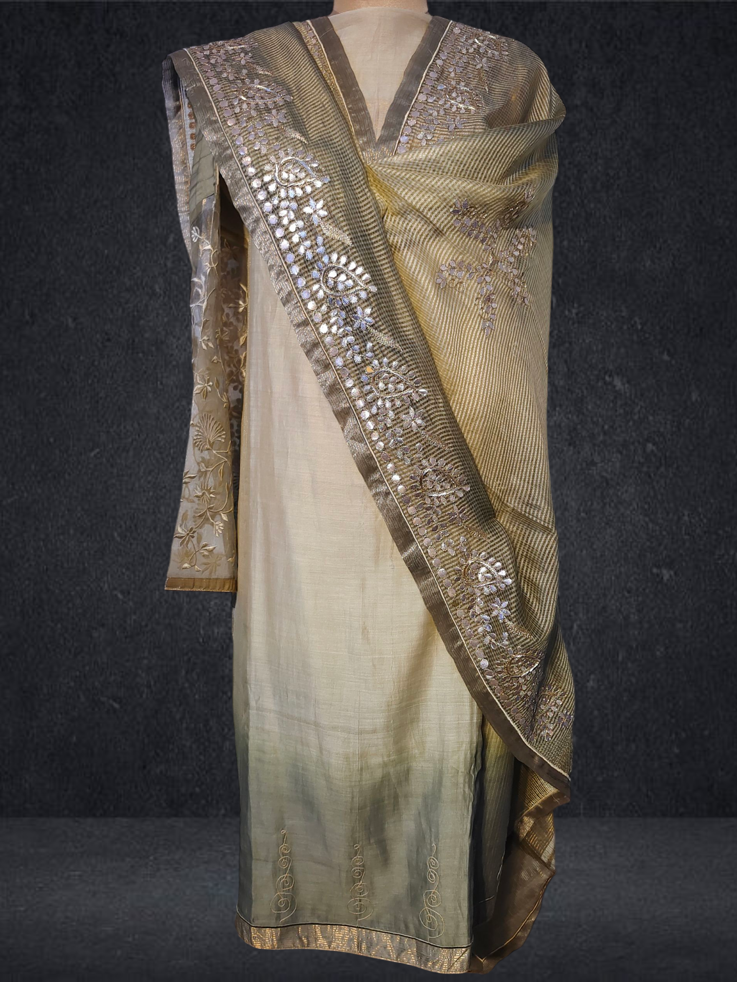 It is paired with a shaded Chanderi dupatta with floral motifs. The dupatta measures 2.5 meters in length and 38 inches in width.The ensemble is provided with a matching cotton satin bottom material for 2.5 mts.
