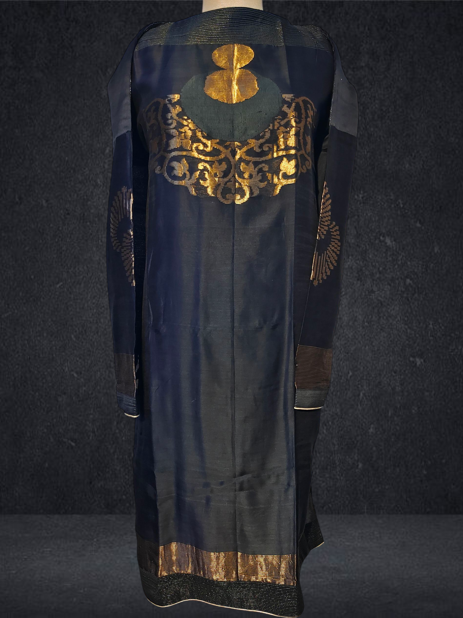 This 3 pc suitset features an elegant zari woven buta kurta and textured chanderi designed in unique abstract floral theme.Kurta is 48 inch maximum in length but can be shortened as per requirement as there is no neckline .The single side ghera is 34 inch so sizes upto 5XL are possible to get tailored in this material.The kurta is prelined with cotton mal.