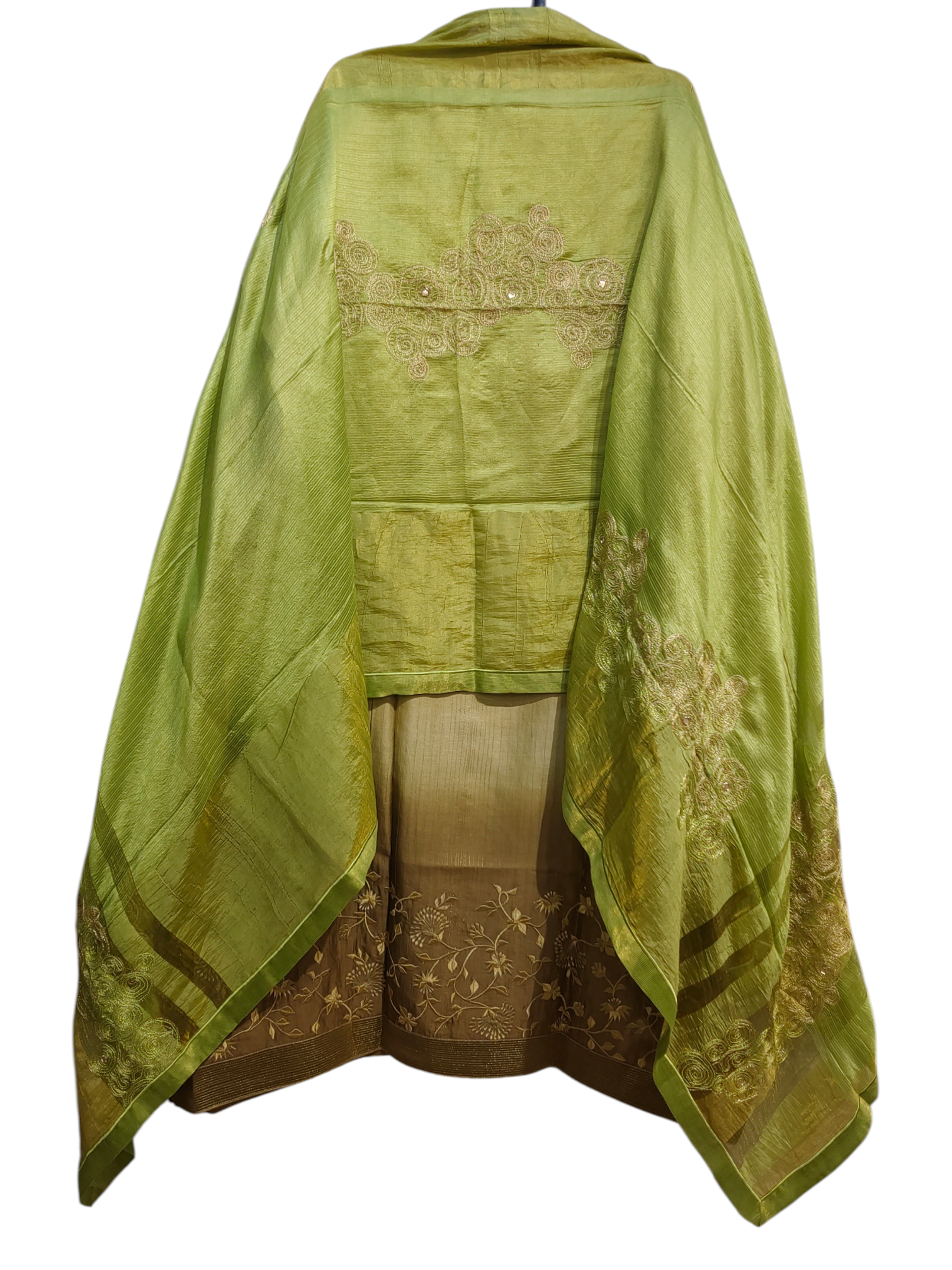 The dupatta measures 2.5 meters in length and 38 inches in width.The ensemble is provided with a matching cotton satin bottom material for 2.5 mts.