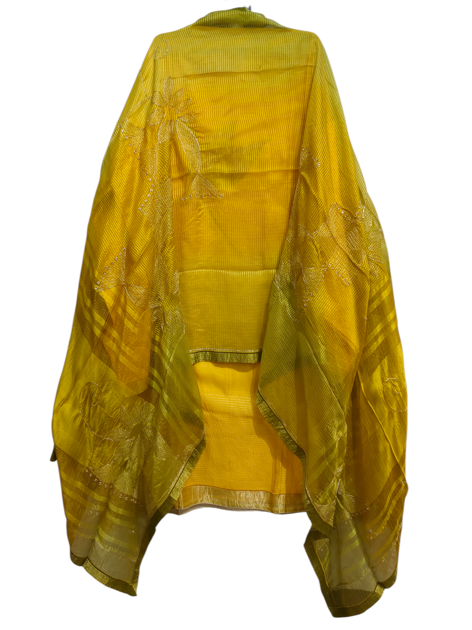 The dupatta measures 2.5 meters in length and 38 inches in width.The ensemble is provided with a matching cotton satin bottom material for 2.5 mts.