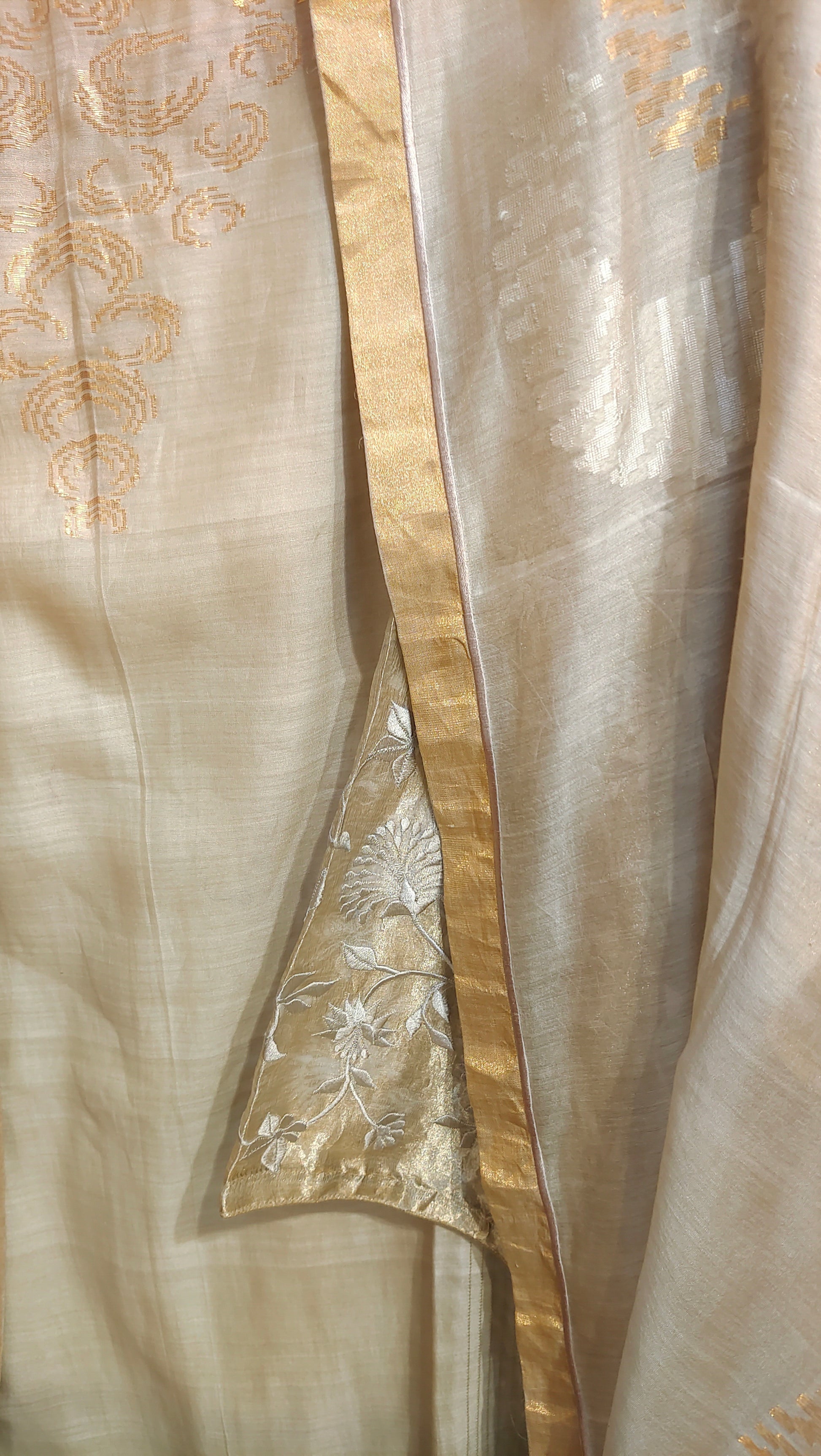 Understated and luminous, this Chanderi kurta suitset is rendered in a refined Badami Sand tone with gentle hints of muted sage that lend the ensemble a calm, heritage inspired palette. The kurta features delicate zari embroidery arranged in a softly tapering front motif reminiscent of traditional floral buta compositions. The sleeves carry intricate floral threadwork panels that echo the embroidery at the hem, creating a harmonious balance across the silhouette. Paired with a silk Chanderi dupatta in soft sage and gold tones, adorned with subtle woven motifs and finished with a classic zari border, the ensemble reflects quiet luxury suited for day celebrations and elegant festive gatherings. The coordinated bottom fabric completes the composition with versatile styling possibilities.
