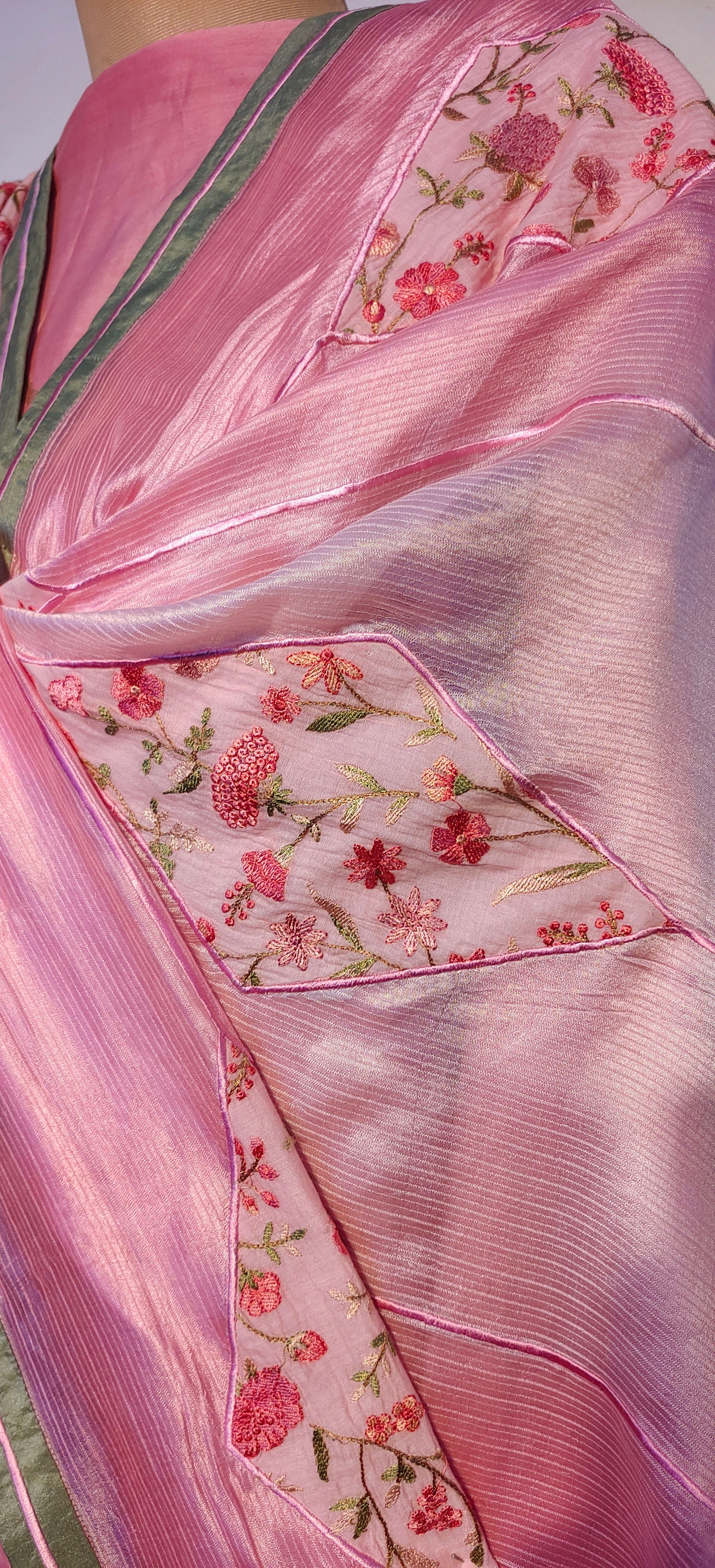 It is paired with a shaded Chanderi dupatta with floral motifs. The dupatta measures 2.5 meters in length and 38 inches in width.The ensemble is provided with a matching cotton satin bottom material for 2.5 mts.