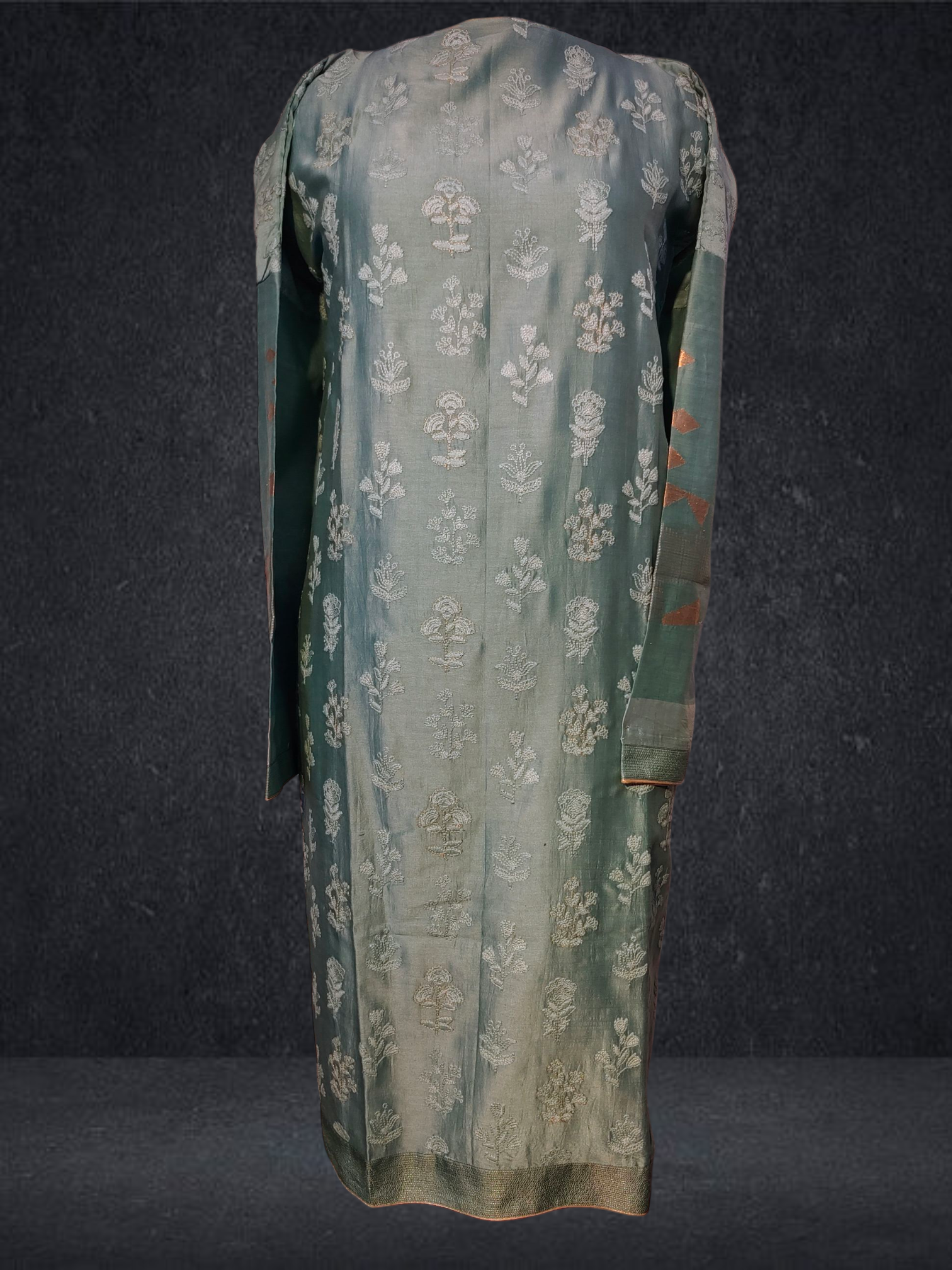 This 3 pc suitset features an elegant zari woven buta kurta and textured chanderi designed in unique abstract floral theme.Kurta is 48 inch maximum in length but can be shortened as per requirement as there is no neckline .The single side ghera is 34 inch so sizes upto 5XL are possible to get tailored in this material.The kurta is prelined with cotton mal.