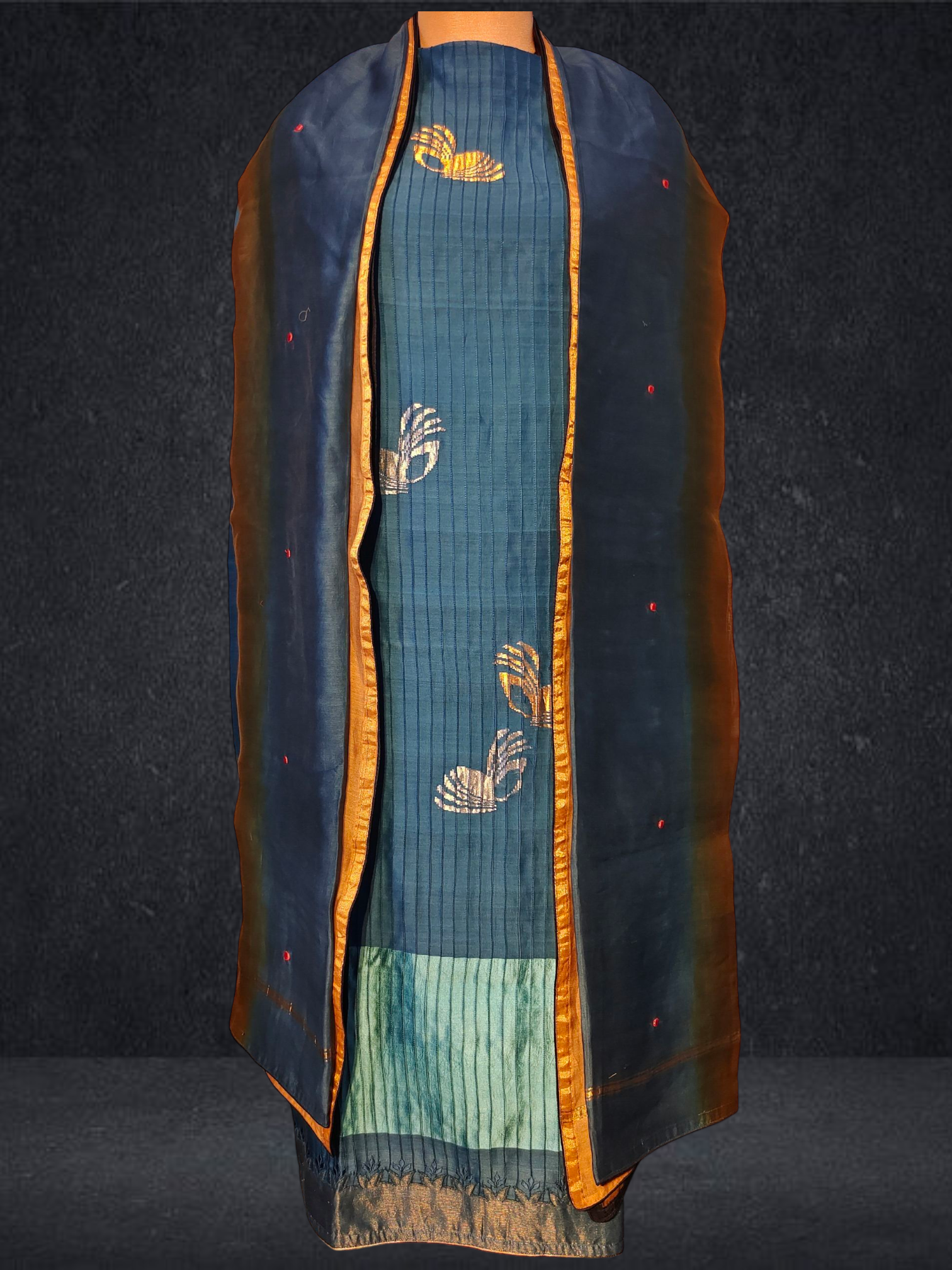 This 3 pc suitset features an elegant zari woven buta kurta and textured chanderi designed in unique abstract floral theme.Kurta is 48 inch maximum in length but can be shortened as per requirement as there is no neckline .The single side ghera is 34 inch so sizes upto 5XL are possible to get tailored in this material.The kurta is prelined with cotton mal.