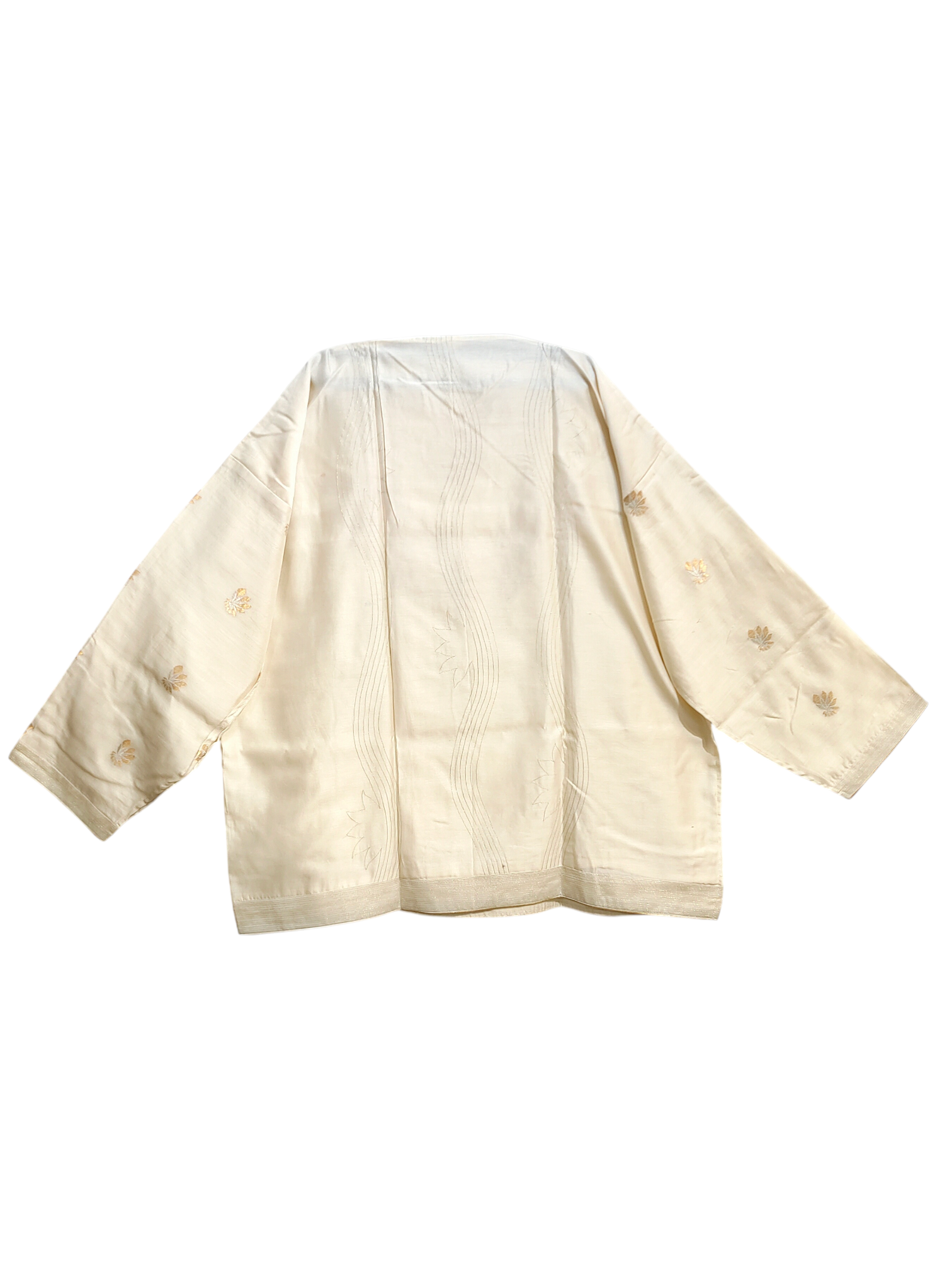 Full-body, edited professional shot of a model wearing an off-white silk waist-length short tunic with gold embroidered floral motifs on the sleeves and an abstract metallic gold motif on the front, paired with a high-waisted flared gold silk umbrella flared skirt with a soft gold sheen, clean minimal fashion product photo, contemporary Indian artisanal styling in the style of Raw Mango fashion editorial.