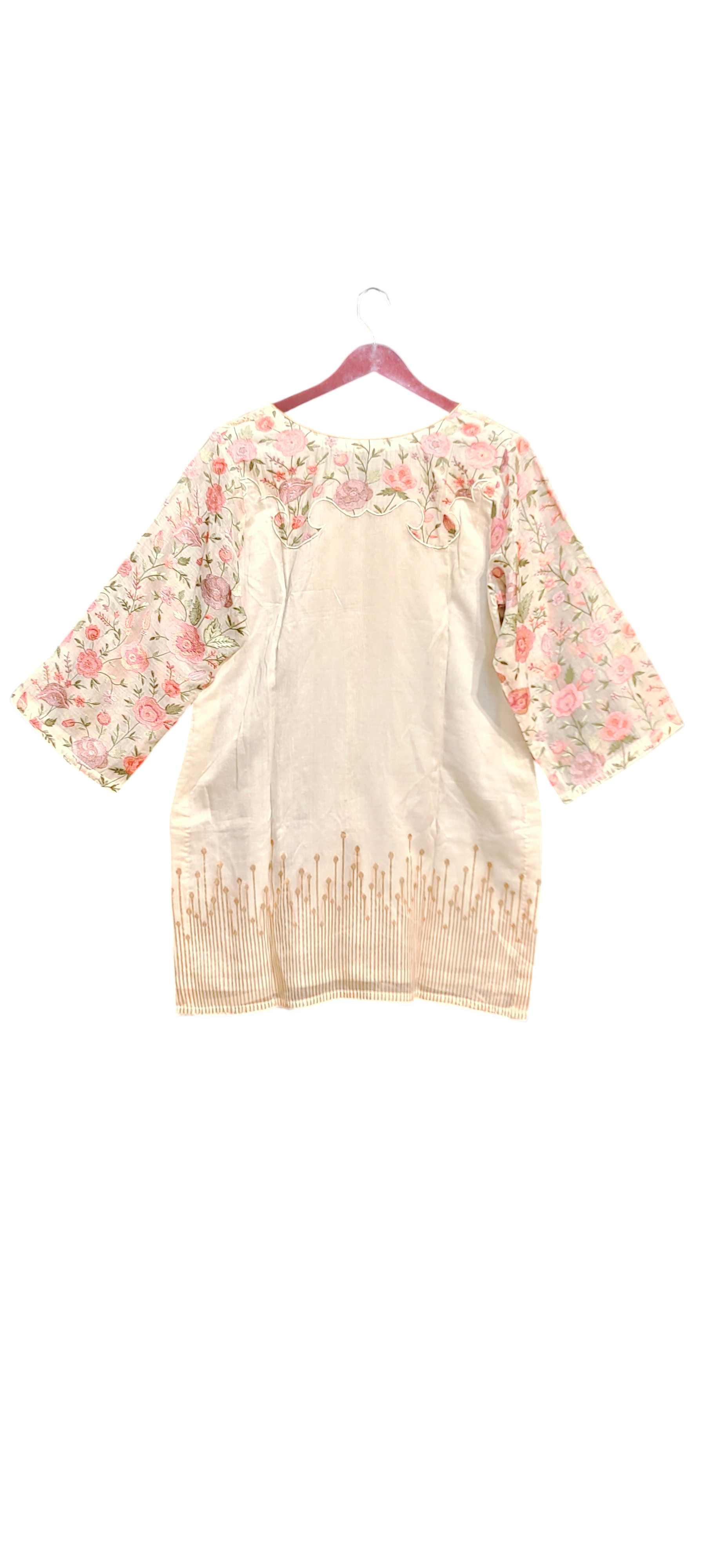 An elegant two-piece ethnic ensemble featuring a straight-cut ivory kurti with floral embroidery on sheer 3/4th sleeves, soft V-neckline, and delicate tonal threadwork on the front and hem, paired with a flowing ankle-length flared skirt in matching ivory fabric with subtle gold striped detailing and a light border