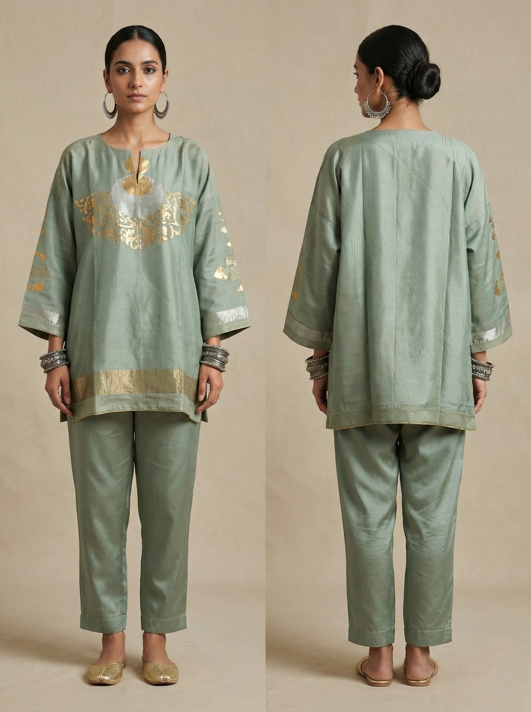 A loose-fit traditional chanderi tunic in muted sage green with wide metallic silver-gold borders and ornate gold foil motifs on the front and sleeves, featuring structured wide sleeves and a clean straight hem,