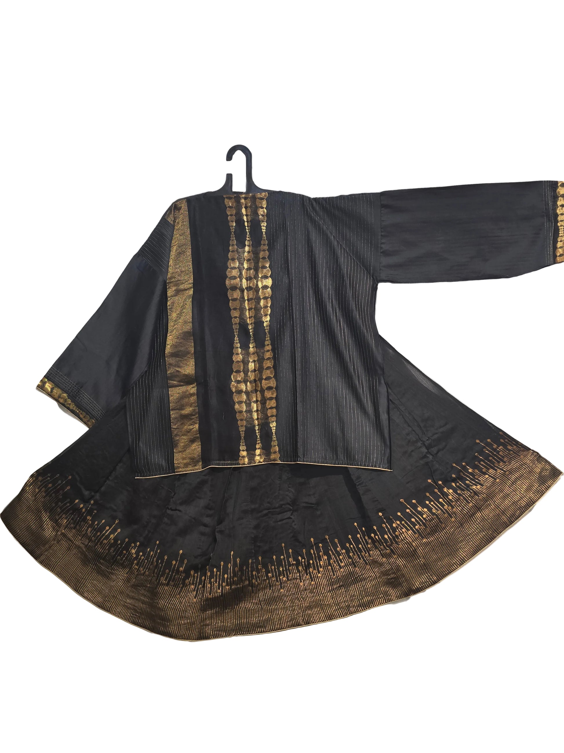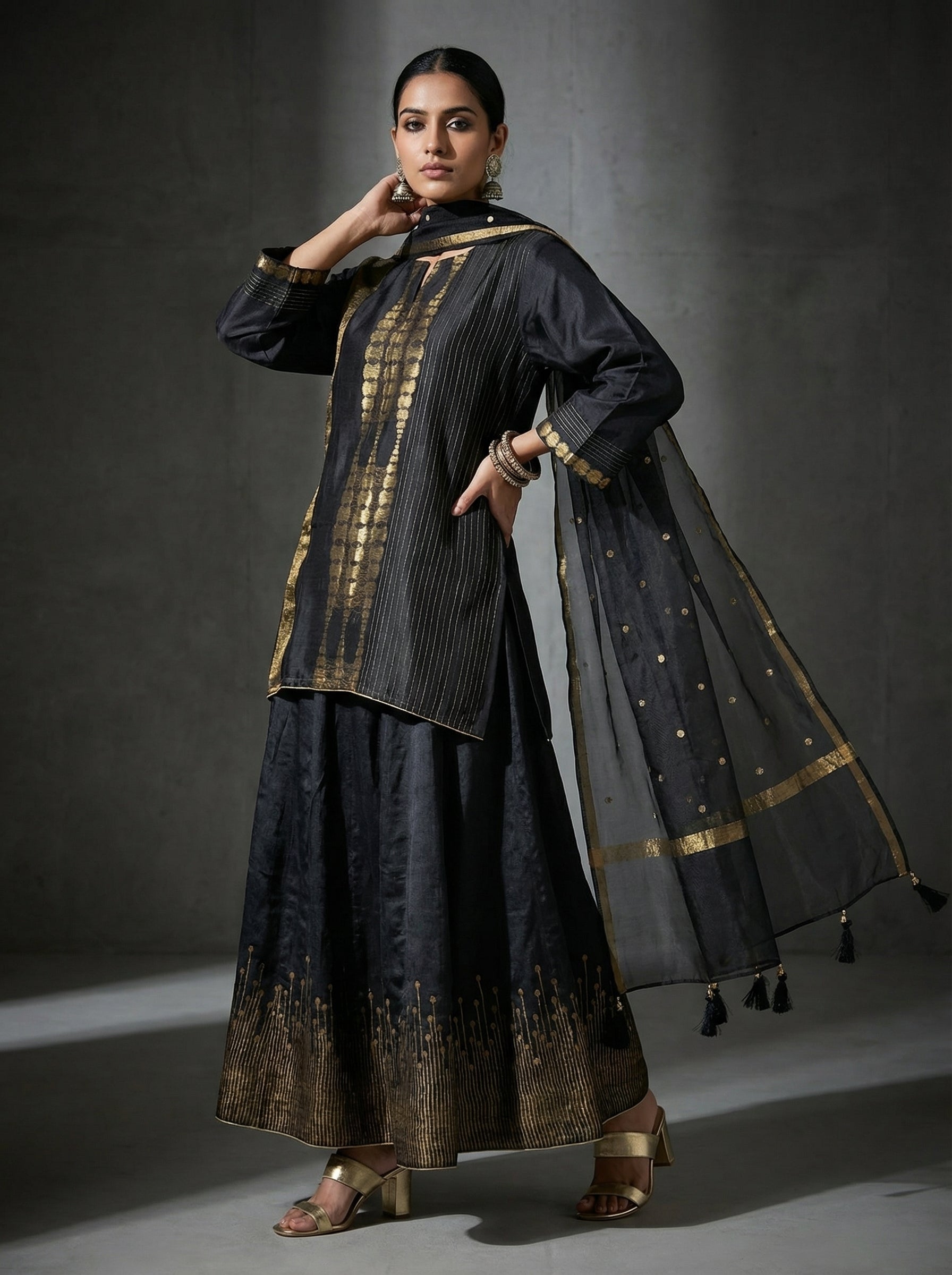 A black three-piece Indian ethnic set featuring a waist-length A-line kurta with vertical gold zari stripes and abstract golden tie-dye panel, wide straight sleeves with metallic borders, paired with a flared black silk skirt showcasing intricate gold thread embroidery at the hem, and a sheer black dupatta with gold polka dots, zari trim, and tassels, styled in the manner of a luxurious Indian festive couture editorial, clean minimal fashion product photo, fashion artsy pose