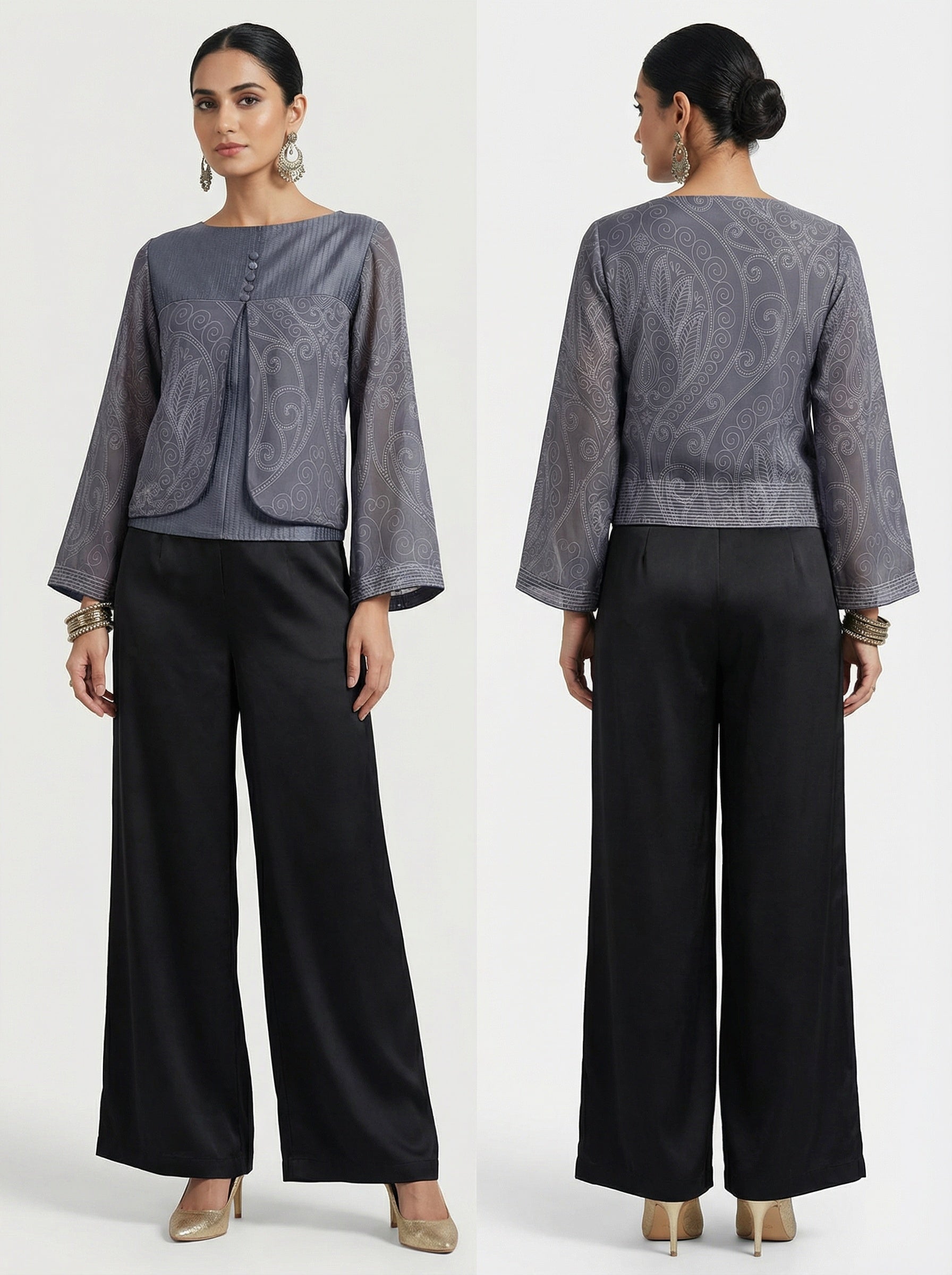This exquisite Semistitcheda slate grey sheer overlay blouse with boat neckline and front button detailing, featuring all-over tonal paisley and swirl embroidery, structured waistband with horizontal pin-tuck detailing, and full-length flared sleeves with matching embroidered cuffs .The short blouse has a very unique formal appeal and can be coordinated with trousers for a indo western look.