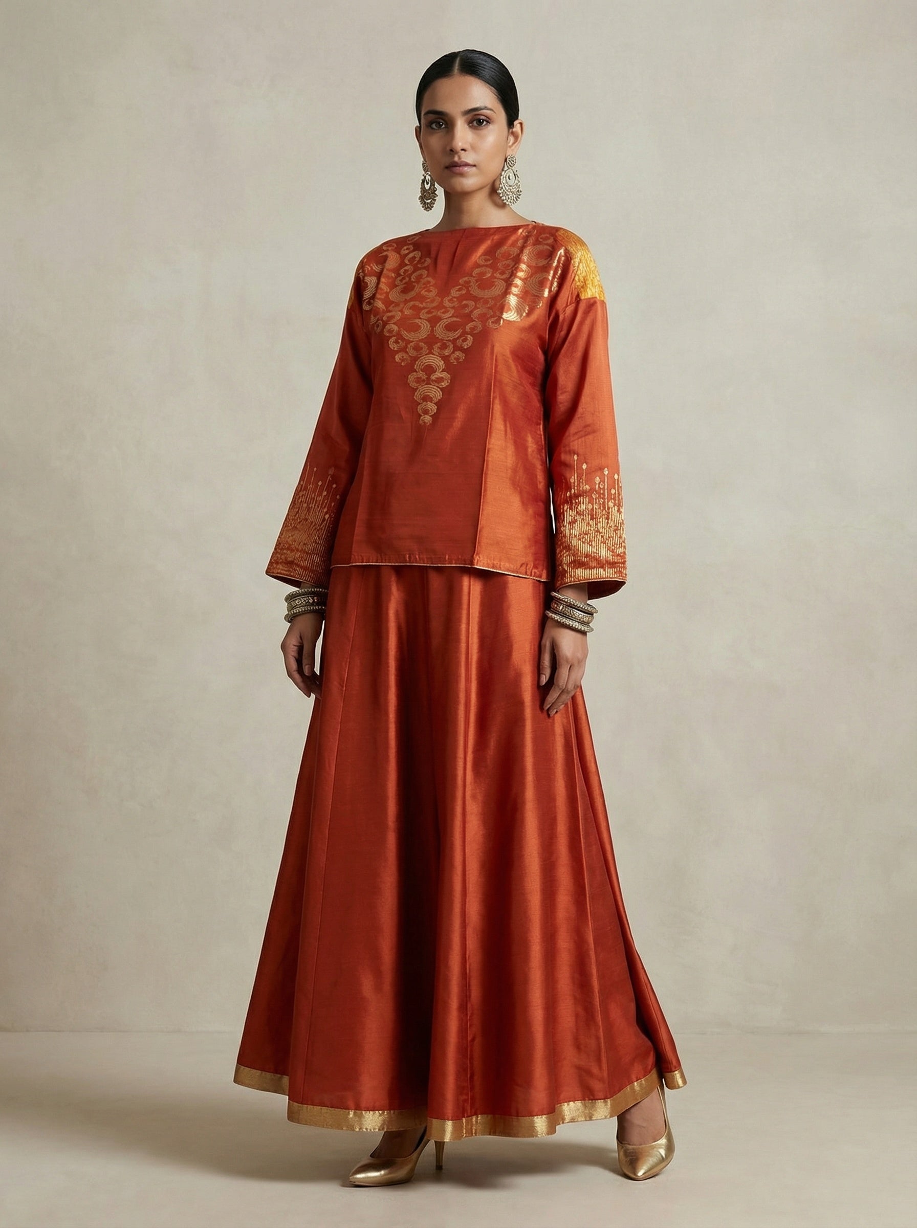 A burnt orange silk blouse with a boat neckline, featuring golden circular woven motifs on the front and back, paired with full-length sleeves adorned in gold thread embroidery and subtle pleating, back panel showcasing a bold yellow and orange abstract pattern with jacquard texture, Either side can be made as front depending upon the purpose, whether to be used with a saree or with a dhoti pant or skirts .The short blouse has a very unique formal appeal and can be coordinated with trousers for a indo western look.