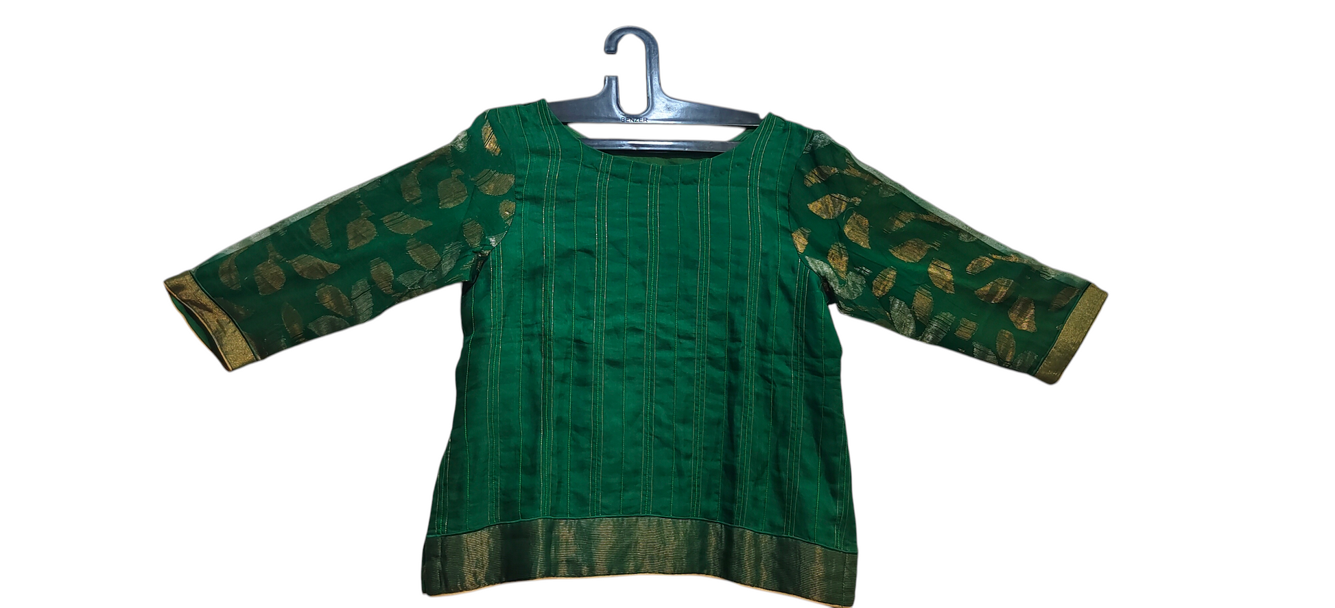 a traditional emerald green brocade BLOUSE with gold leaf motifs, featuring 3/4th sleeves with gold zari borders, a wide round neckline, and a straight mid-hip length cut, styled in the aesthetic of a minimalist South Asian fashion editorial, clean background, fashion catalog pose.