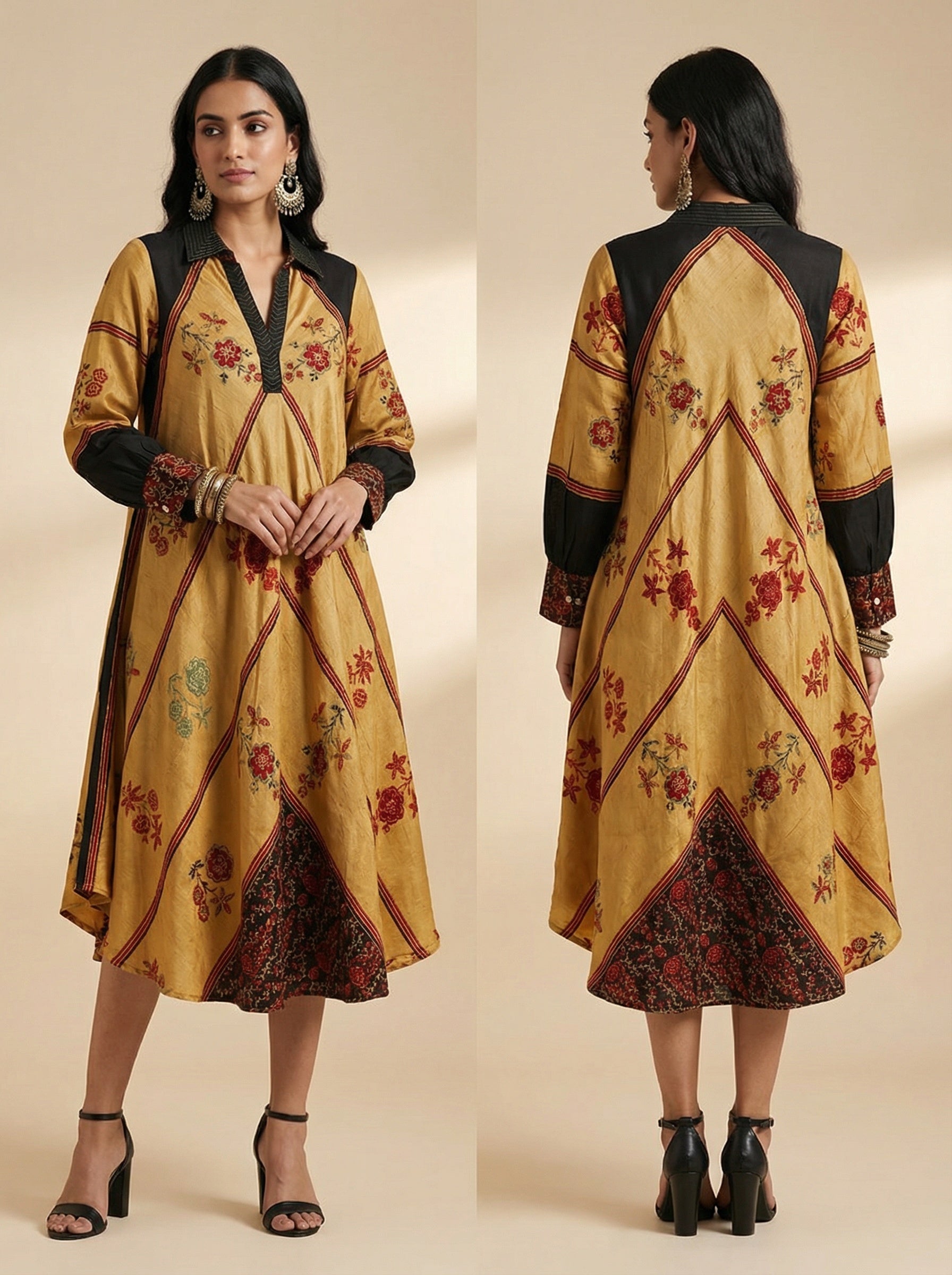 A flared ankle-length A-line dress in rich mustard yellow pure dupion ajrakh printed silk with black shoulder panels and cuffs, featuring intricate floral embroidery in deep red and green across the body and sleeves, highlighted by chevron panel construction and a black embroidered triangular hem insert