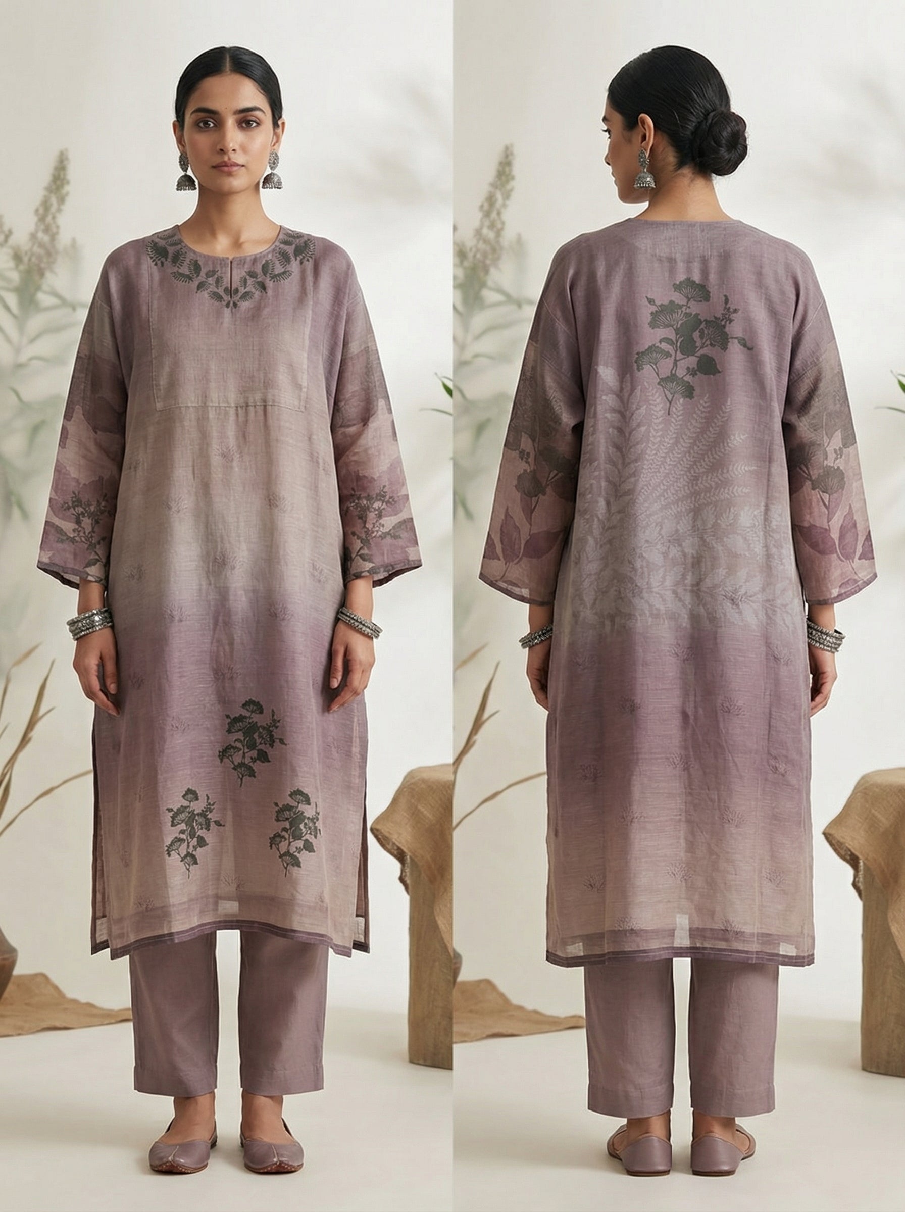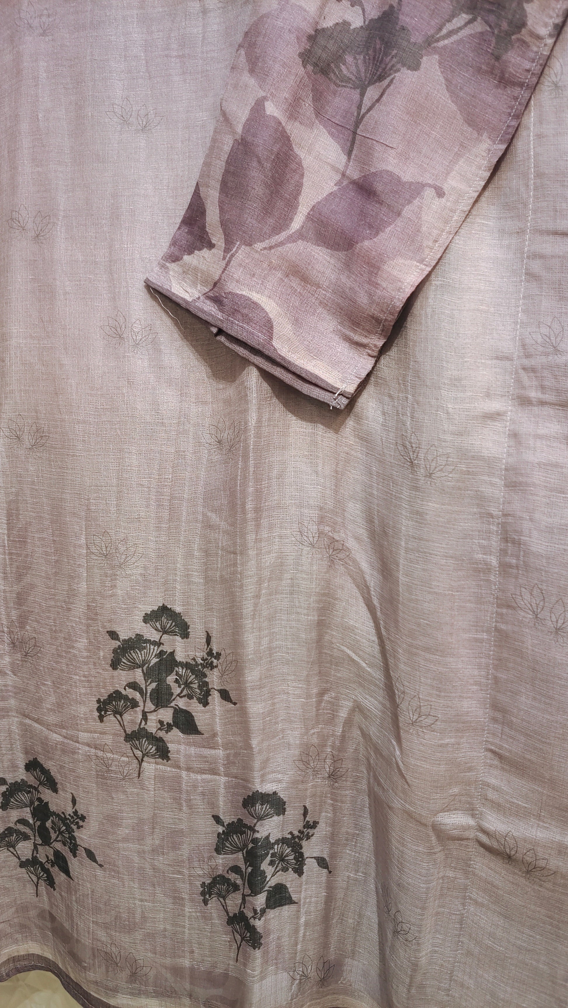 A long silk Kota linen digital printed kurta with wide three-quarter sleeves, in a soft taupe-to-dusty-lavender gradient featuring subtle tonal fern and leaf motifs with dark floral accents on the hem, shoulders, and sleeves