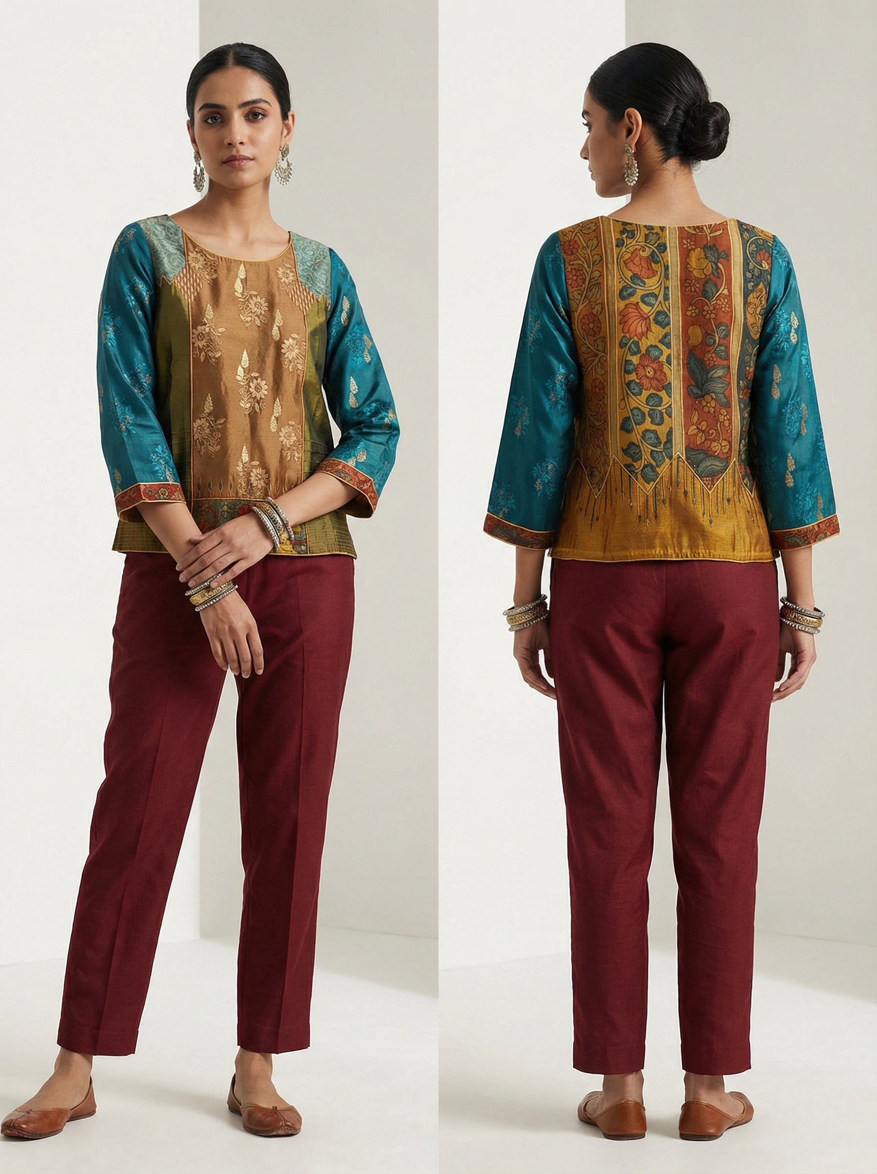 Either side can be made as front depending upon the purpose, whether to be used with a saree or with a dhoti pant or skirts .The short blouse has a very unique formal appeal and can be coordinated with trousers for a indo western look.