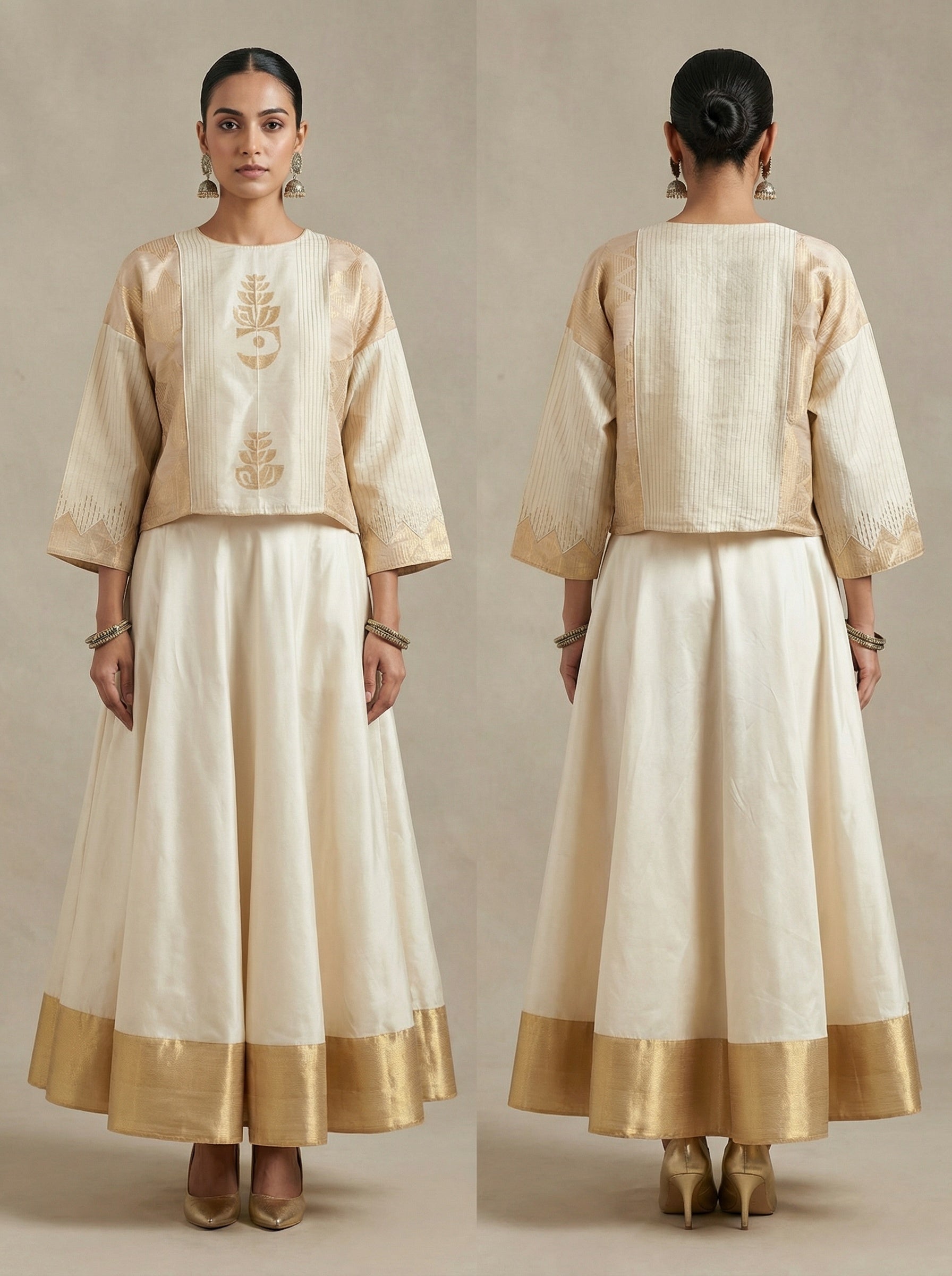 A structured ivory silk blouse with subtle golden zari accents. The blouse features a front-panel design embellished with handwoven temple motifs in gold, complemented by lustrous geometric brocade on the sides and sleeves. The broad neckline and straight-cut silhouette create a minimal yet regal appearance.