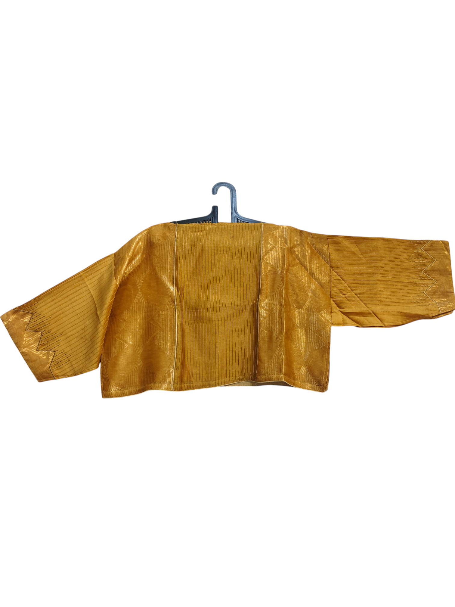 A luminous mustard-yellow silk blouse, showcasing intricate golden zari work in geometric patterns along the sleeves and side panels. The blouse has a clean, structured silhouette with a broad neckline and cropped length, The sheen of the fabric adds depth and richness, while the back features subtle chevron weave detailing.