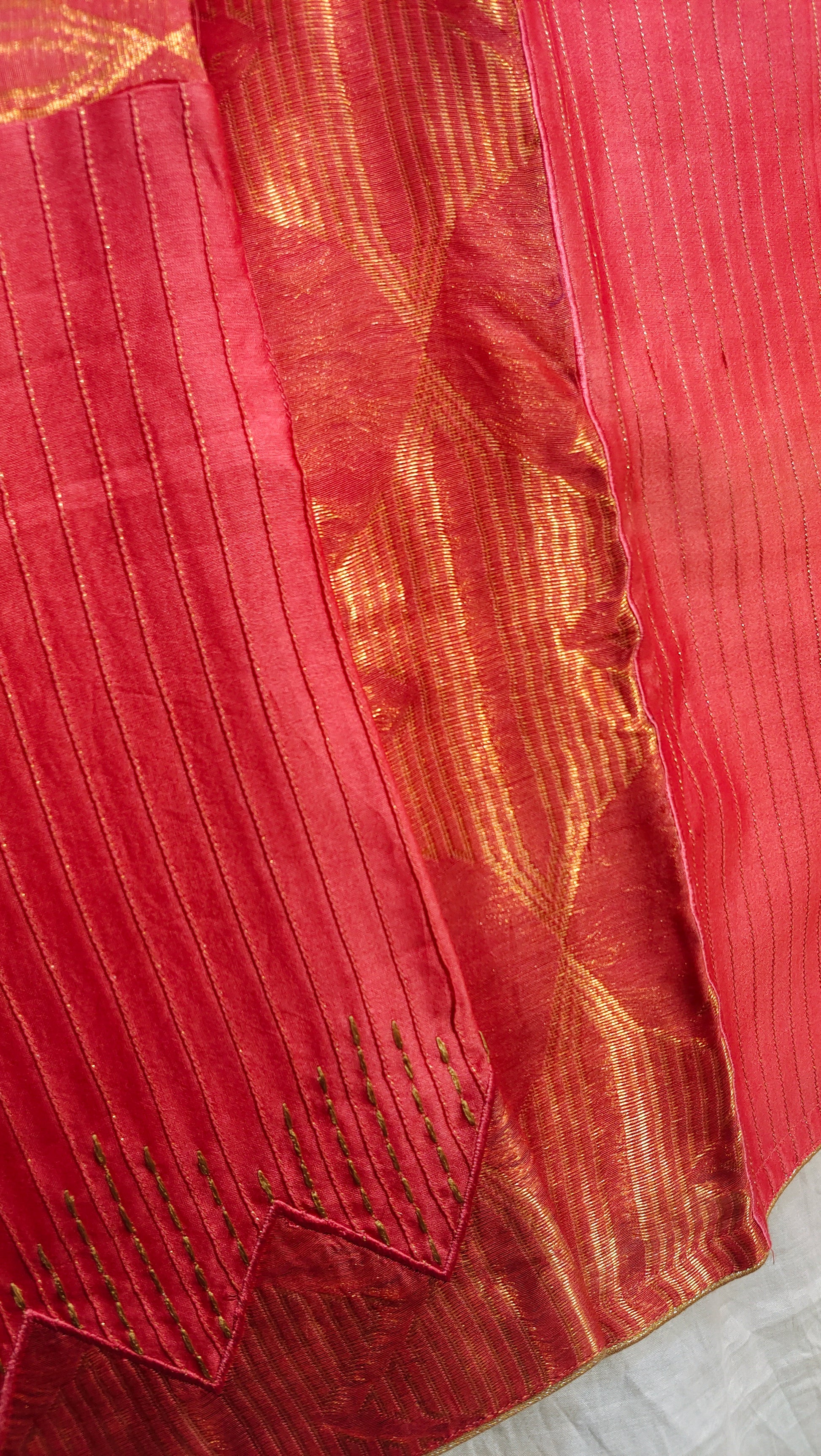 A cropped rust-orange silk blouse featuring a rich interplay of textures — finely pleated silk panels at the front, bold gold geometric brocade on the sides and sleeves, and zigzag embroidery accents on the cuffs. A deep V-motif at the back adds architectural detail.