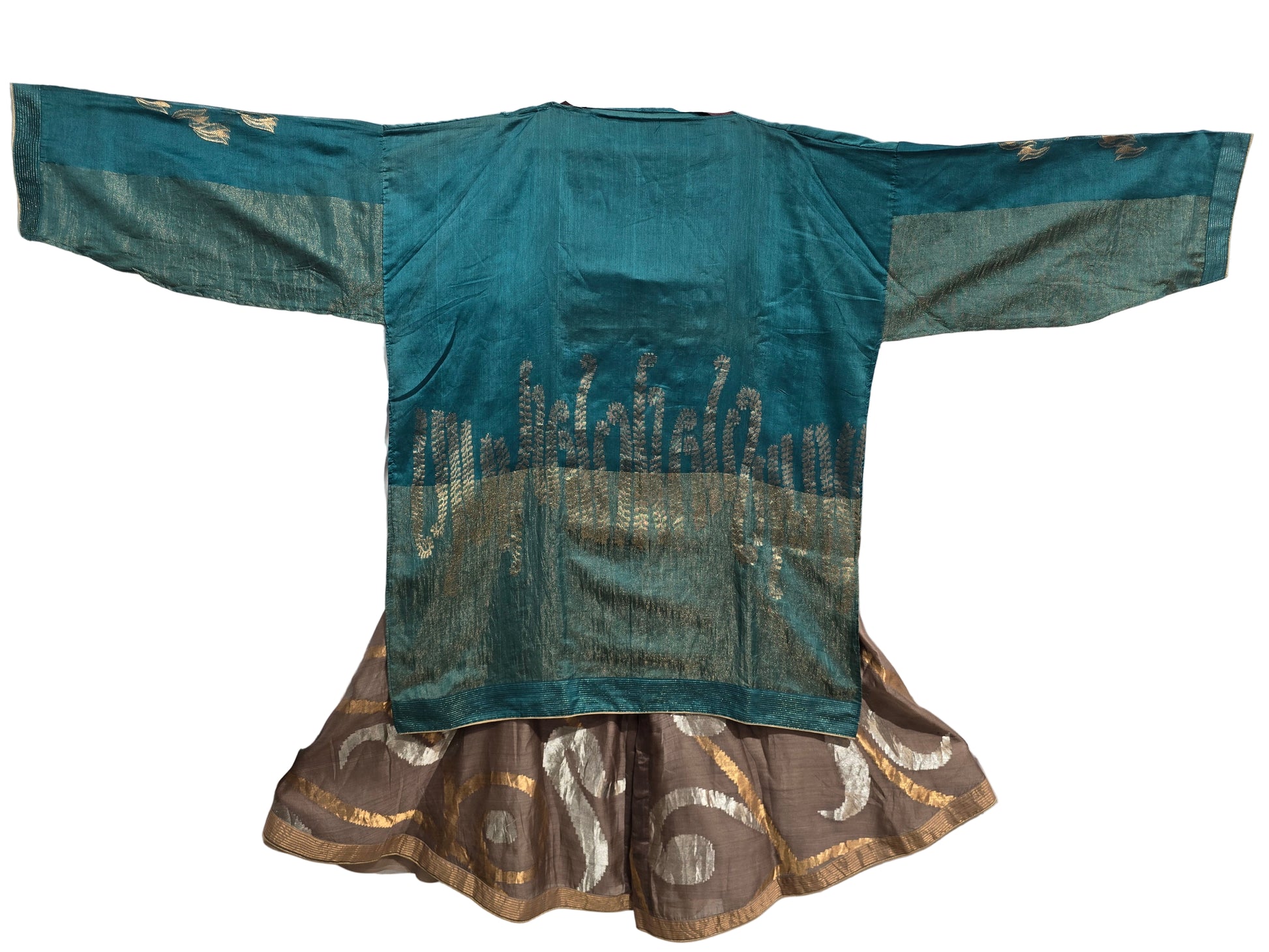 A teal silk straight-cut long top with wide sleeves, gold woven detailing and subtle geometric threadwork on the back, paired with high-waisted flared palazzo pants in earthy brown with oversized metallic gold and silver swirl patterns.
